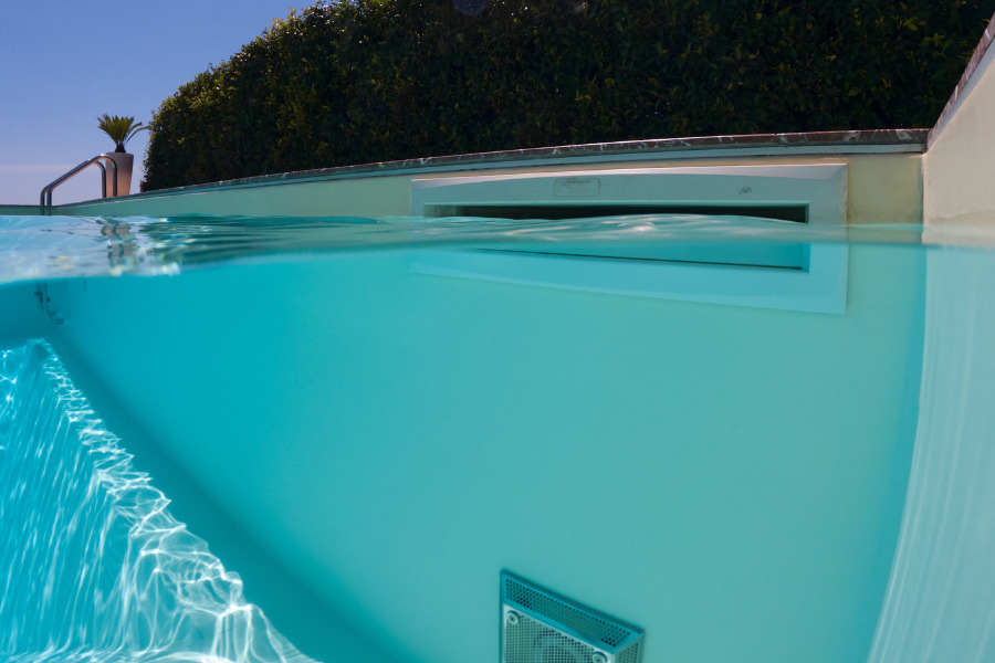 Gli skimmer classici vanno posizionati a circa 15 cm dal bordo della piscina, quindi il livello dell’acqua si trova al di sotto del piano del pavimento esterno. Gli skimmer sfioratori invece permettono di ridurre fino a 5-8 cm la distanza del livello dell’acqua con il bordo.