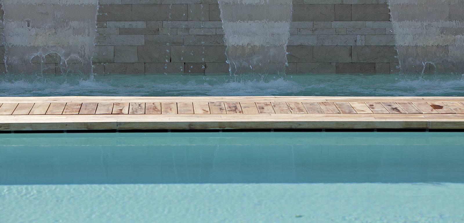 Le finiture di questo bordo possono essere realizzate in materiali come gres, marmo, pietra e legno, e fissate al bordo sfioratore diventando al tempo stesso un tutt’uno con il rivestimento circostante, per un impatto visivo di grande prestigio.