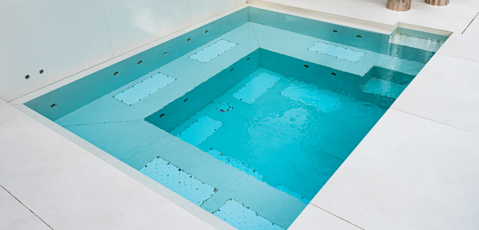 L’azzurro della piscina spicca fra le eleganti tonalità neutre dell’arredo esterno e delle finiture in gres porcellanato bianco.