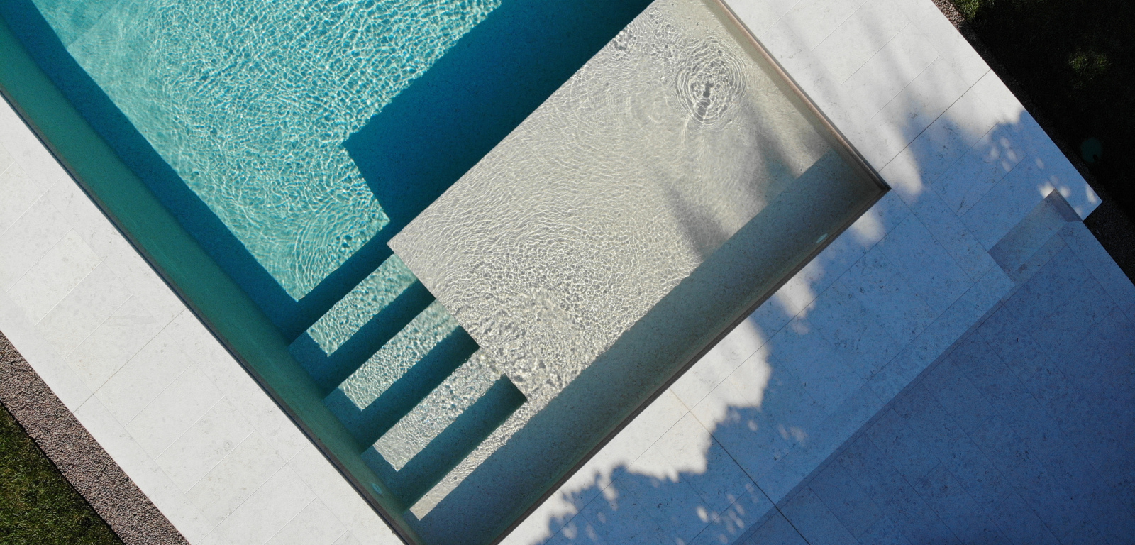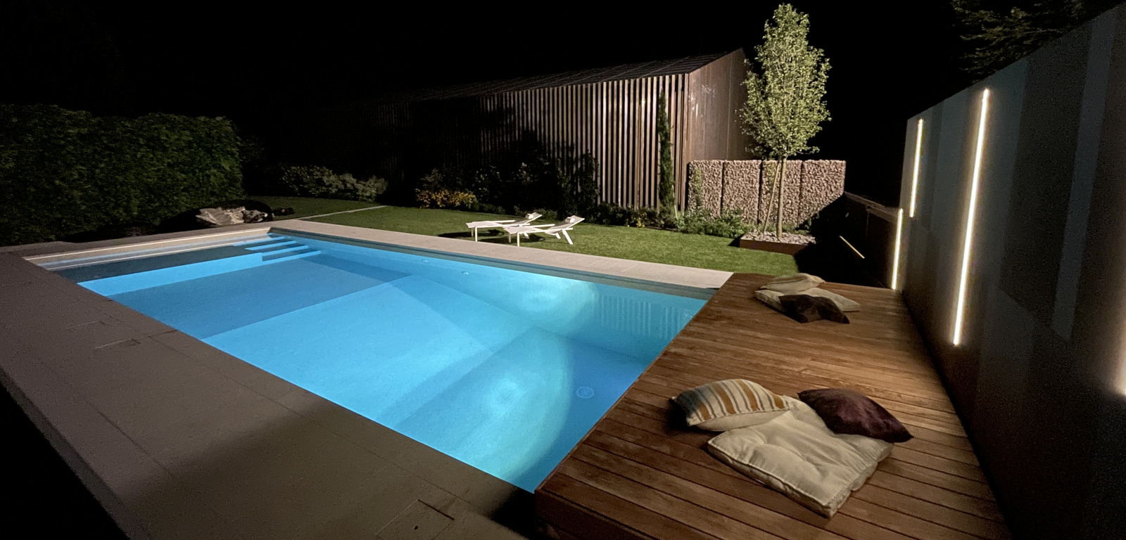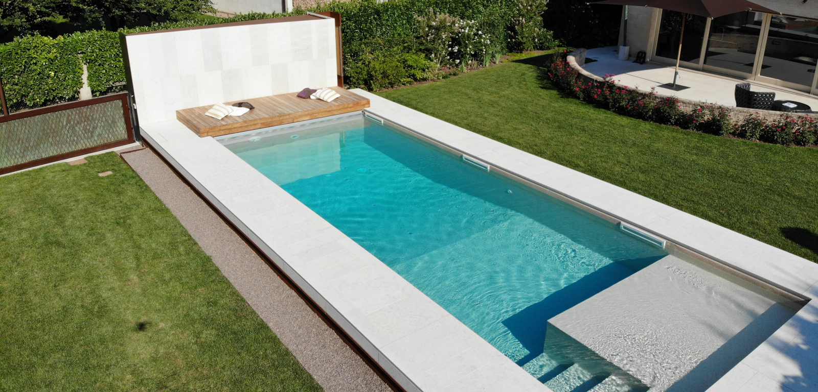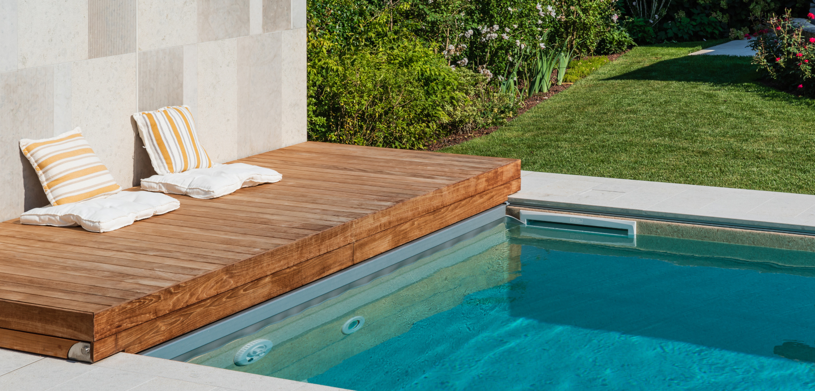 La copertura Blueguard scompare in modo discreto sotto la zona solarium realizzata in legno e la pompa di calore offre comfort termico anche durante le mezze stagioni.