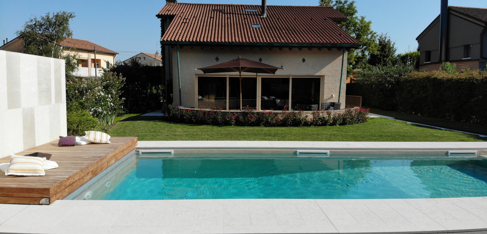 Il giardino di una villa nella campagna trevigiana è stato impreziosito con la realizzazione di questa ampia piscina.