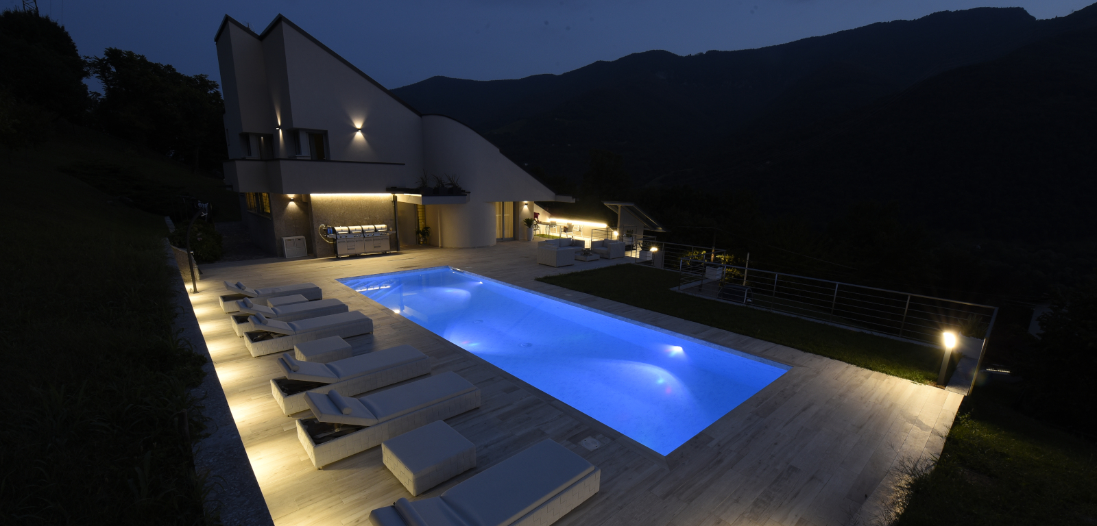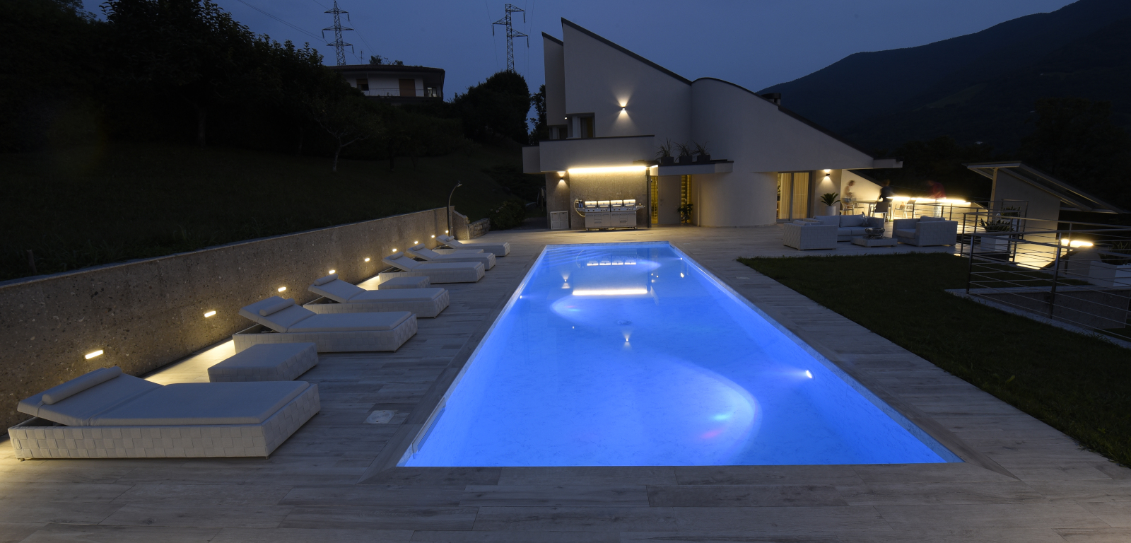 La pavimentazione esterna in gres è in perfetta armonia con l’abitazione e l’illuminazione con i fari RGB crea un’atmosfera suggestiva e scenografica, per un bagno rilassante anche nelle sere d’estate.