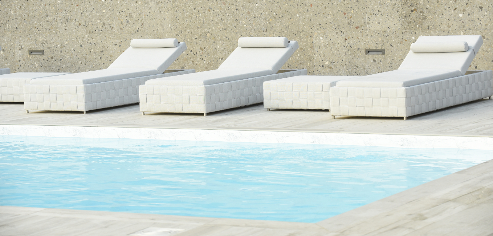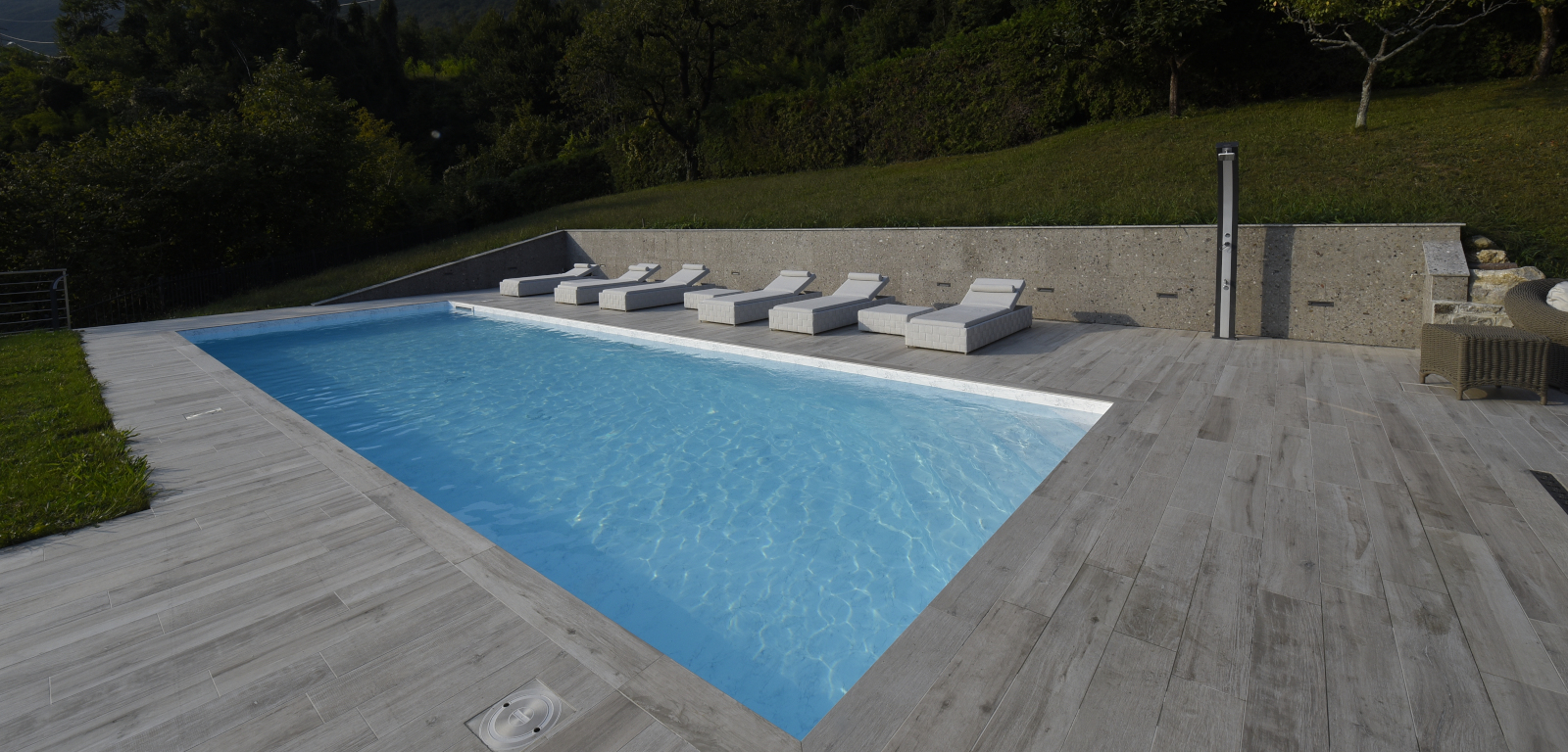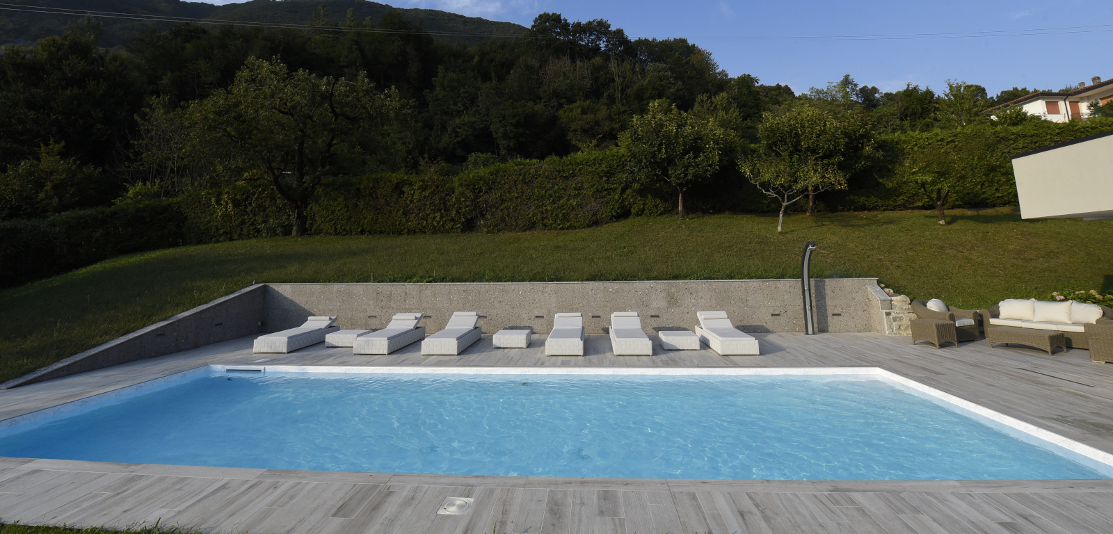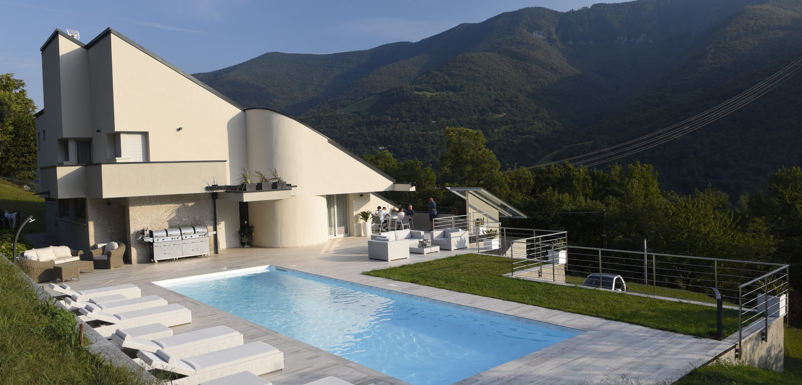 La piscina è incastonata in un paesaggio verde e circondato da montagne: le linee e le forme della piscina sono semplici ma con un tocco di esclusività dato dal rivestimento interno Touch Vanity che richiama l’effetto del marmo bianco e dona alla piscina luminosità.