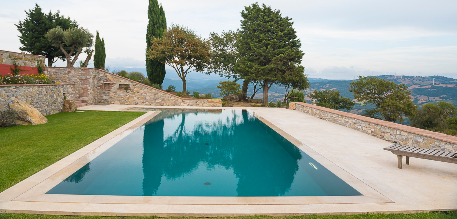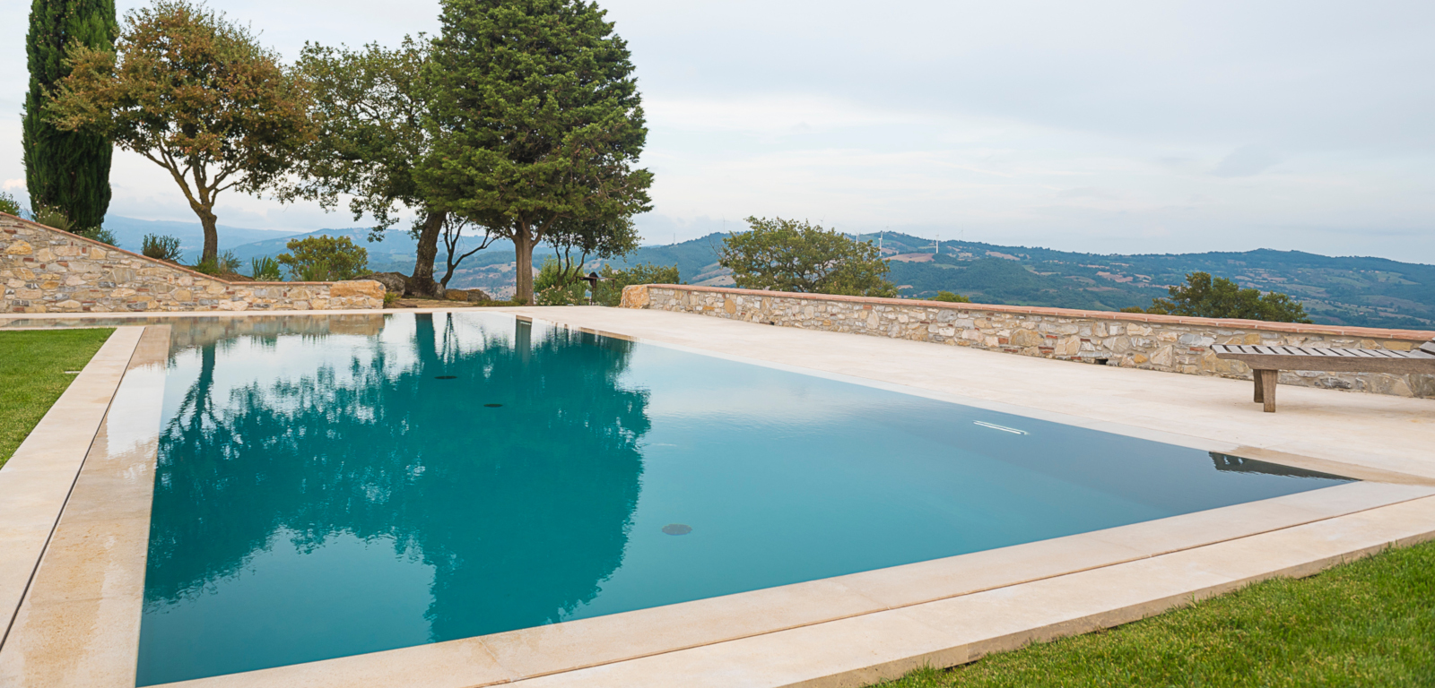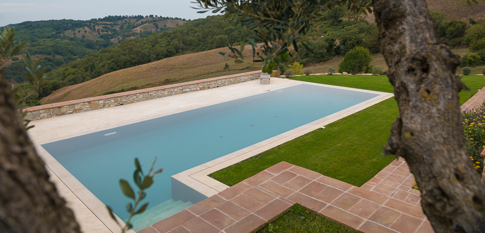 Immersa nella quiete delle colline toscane, questa piscina con un raffinato bordo sfioro Trilogy a fessura riluce in tutta bellezza, illuminata dal sole cui è costantemente esposta. Si inserisce in modo ottimale nel contesto circostante, impreziosendo la cascina rurale che la ospita.