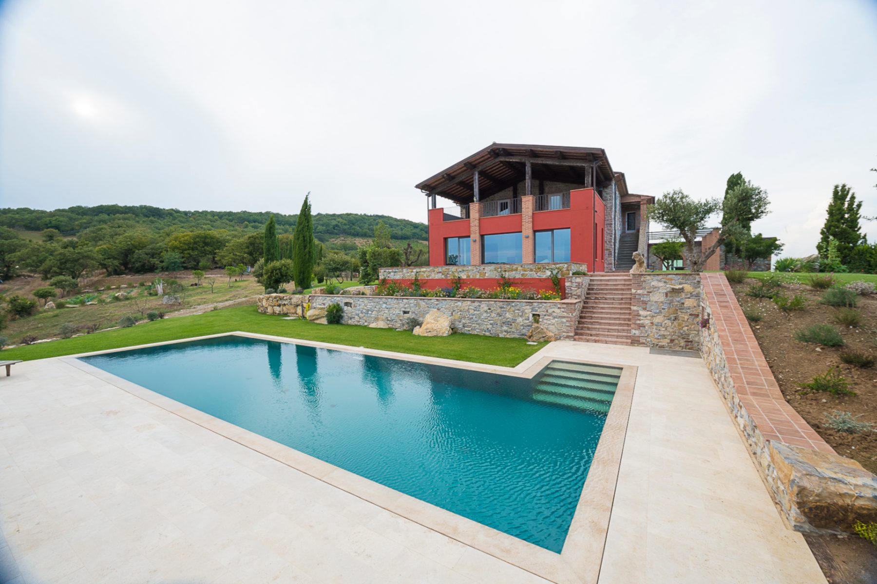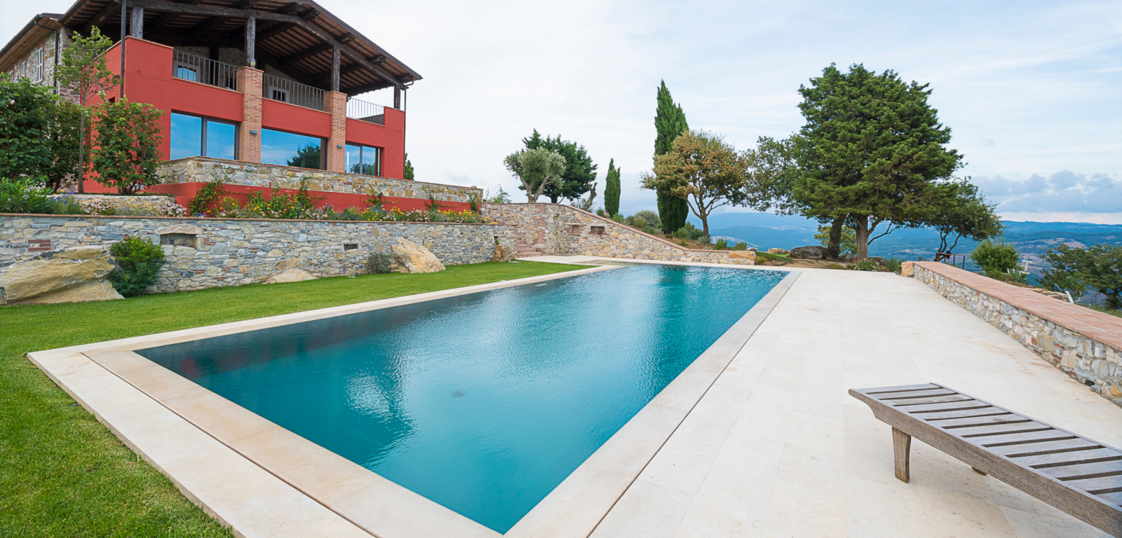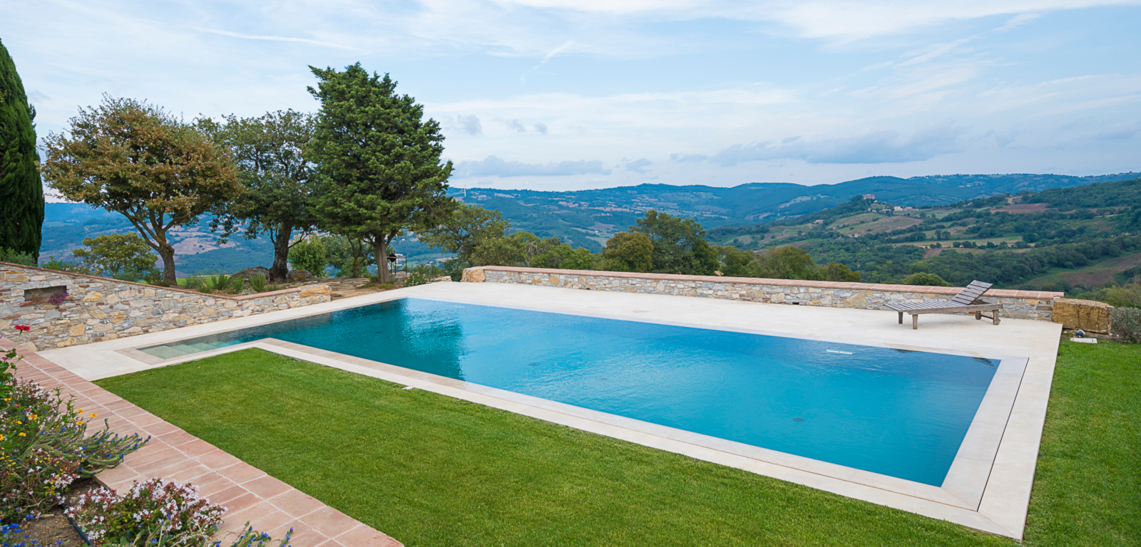 Immersa nella quiete delle colline toscane, questa piscina con un raffinato bordo sfioro Trilogy a fessura riluce in tutta bellezza, illuminata dal sole cui è costantemente esposta. Si inserisce in modo ottimale nel contesto circostante, impreziosendo la cascina rurale che la ospita.