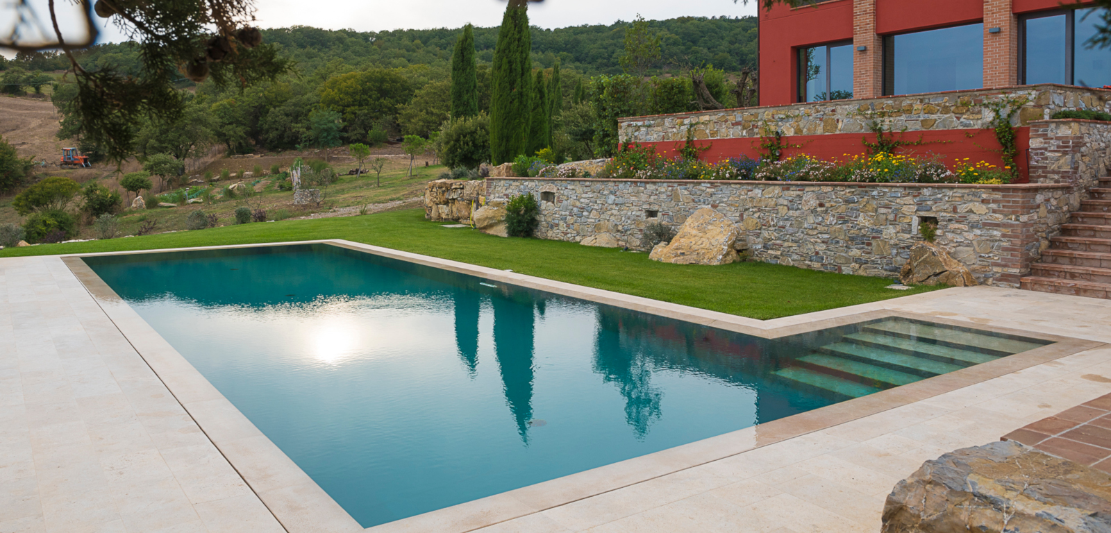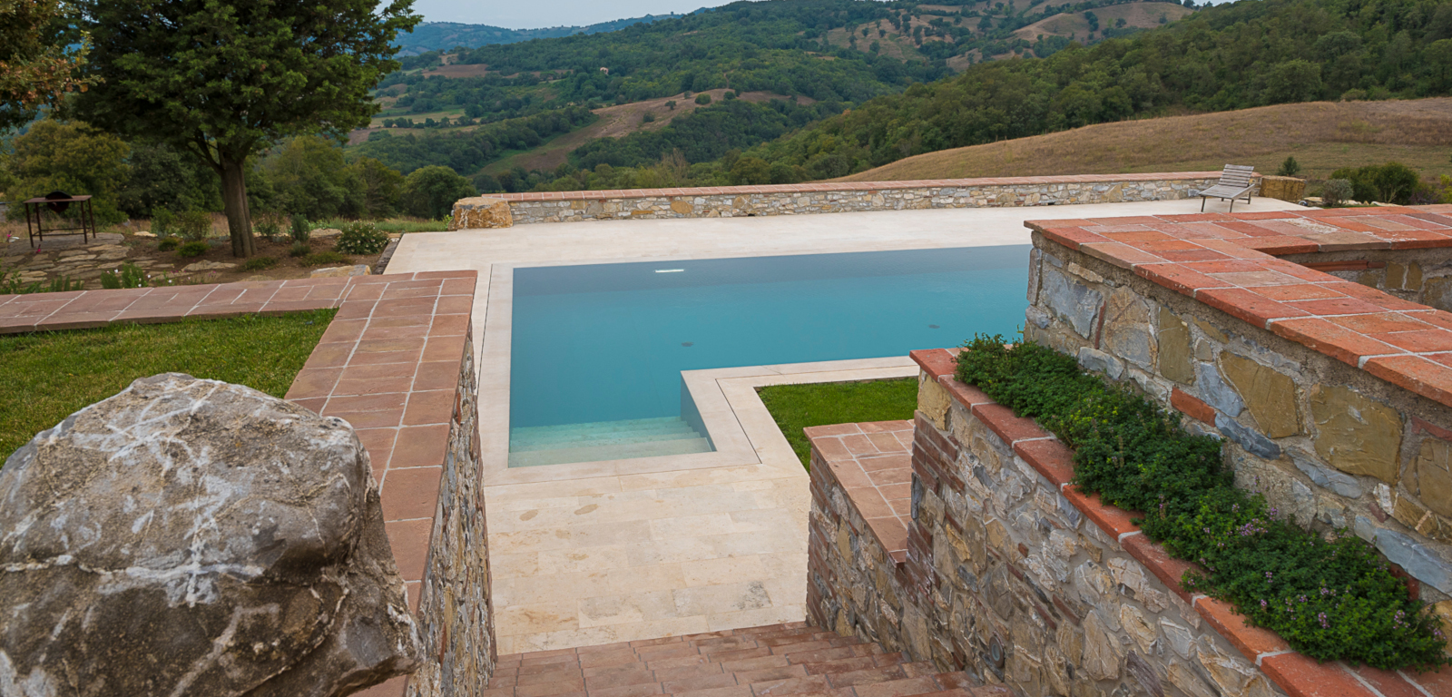 La scala recessa rende piacevole e graduale l’ingresso in acqua, i fari Blade creano suggestive atmosfere serali. La pavimentazione esterna in travertino esalta il fascino di questa piscina dai profili essenziali.