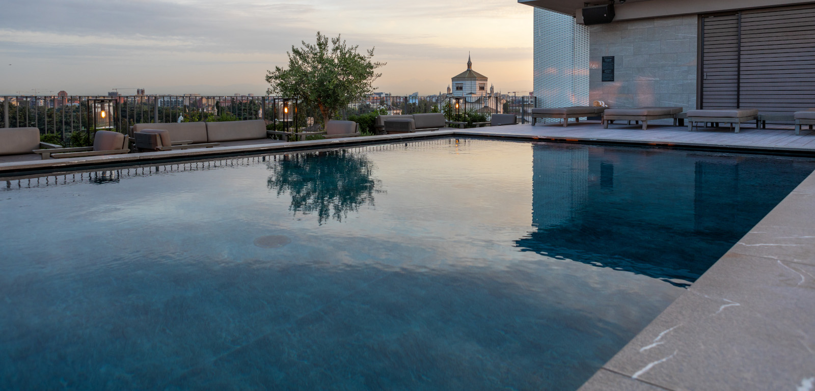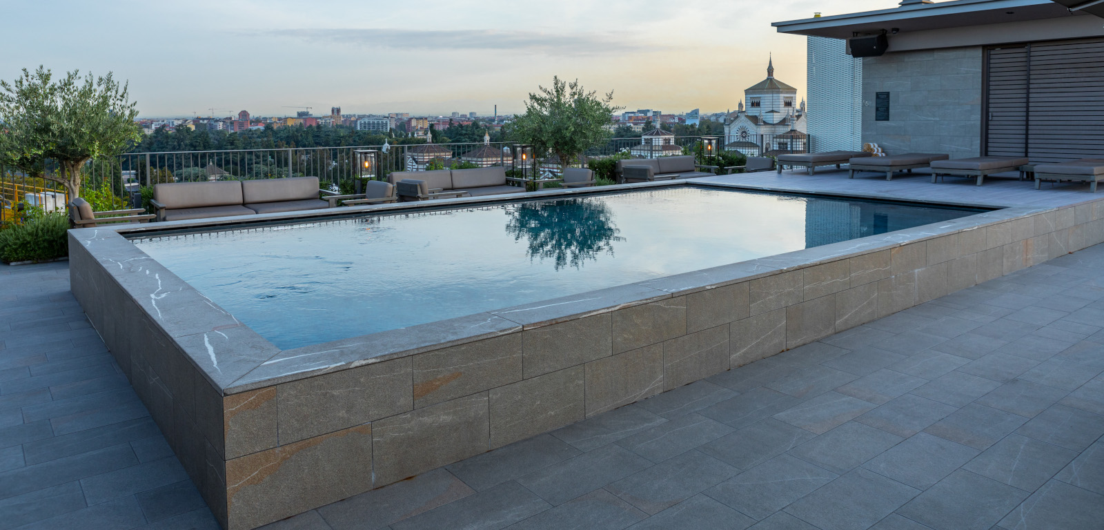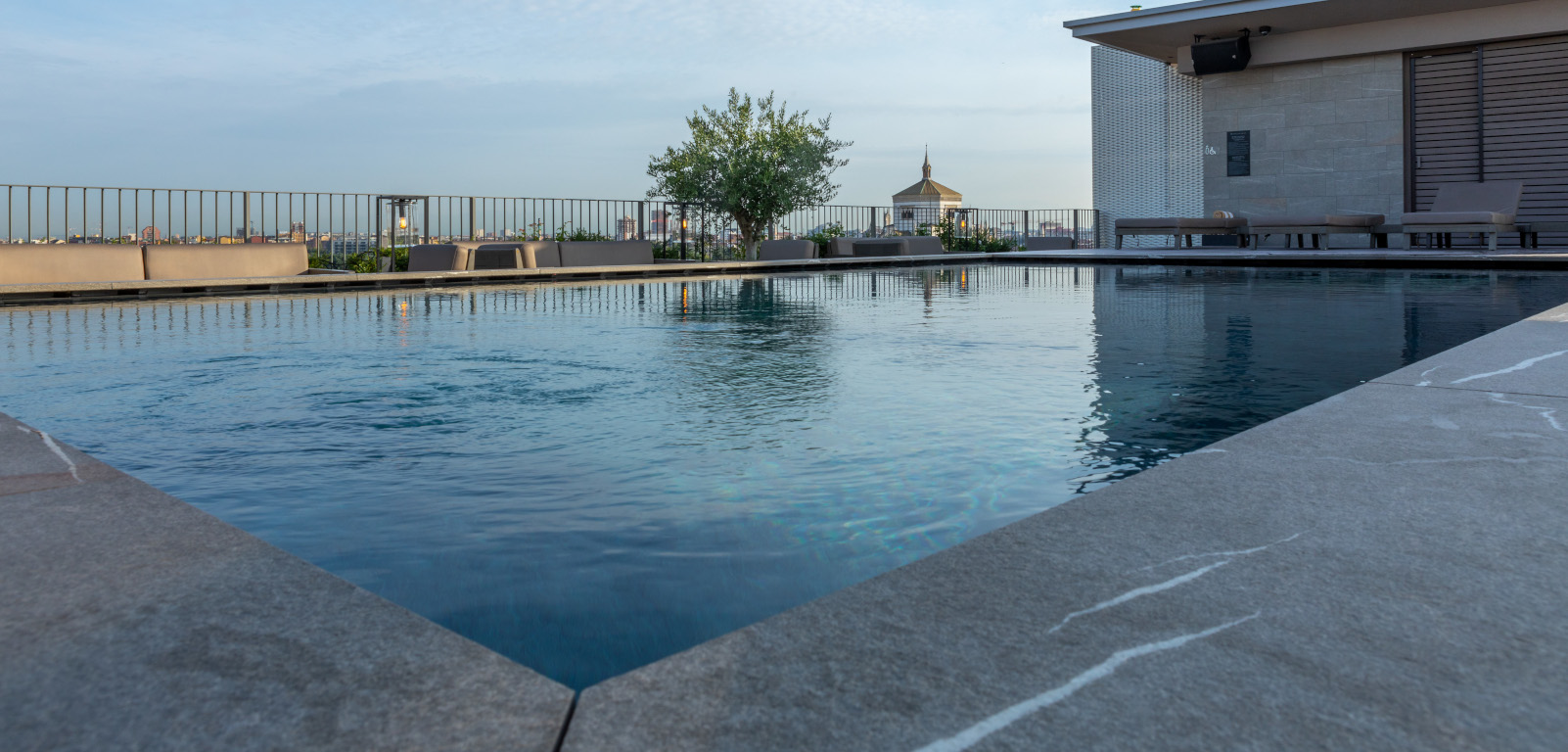 Creata sulla terrazza all’ultimo piano dell’edificio, la piscina rettangolare con rivestimento interno Touch è l’ideale per il relax della clientela dopo una giornata trascorsa a spasso per la città.