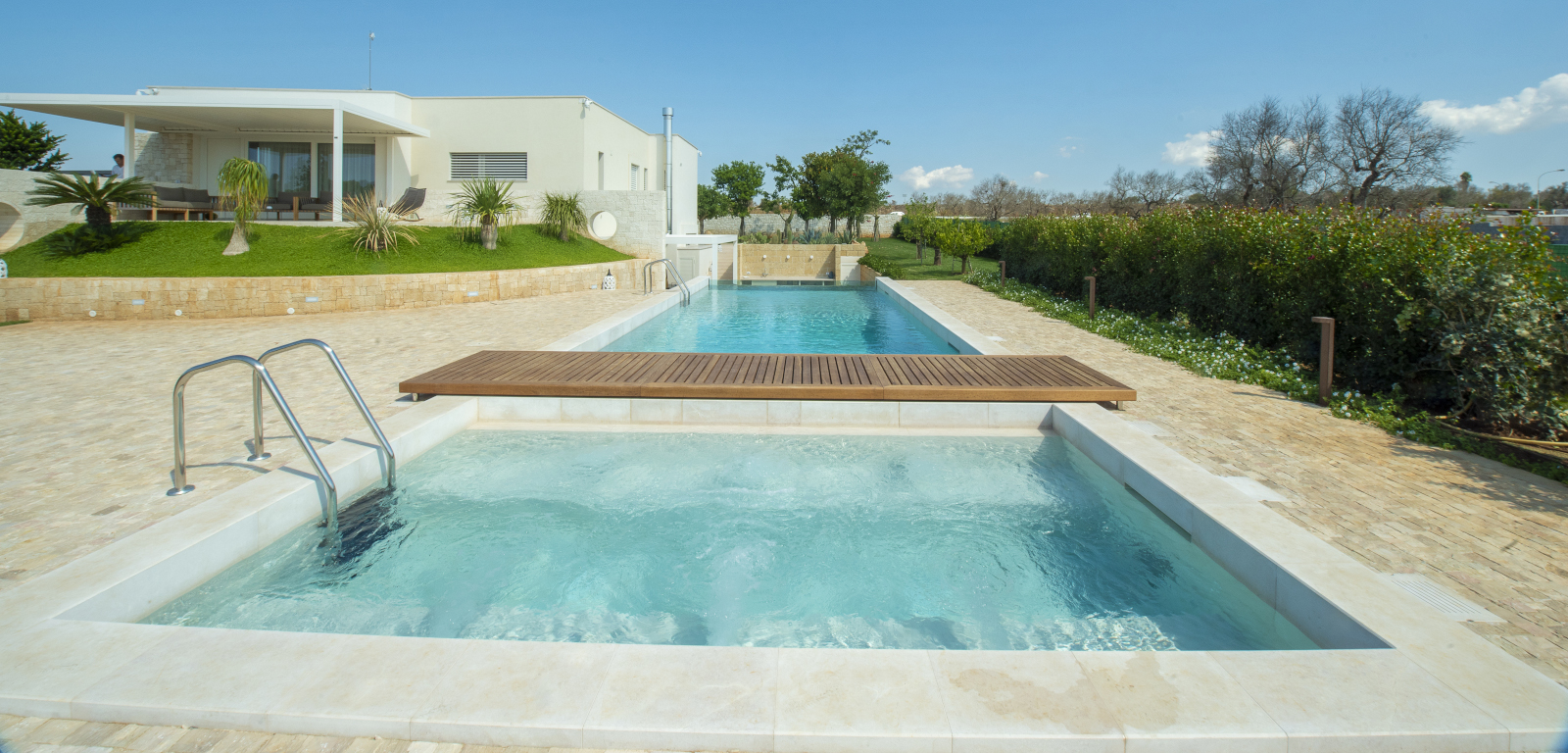 La vasca è composta da due aree accessibili separatamente e suddivise da una zona prendisole in legno. La più piccola è interamente dedicata al relax con un impianto di idromassaggio; la più grande, grazie alle profondità differenti e alla lunghezza, è perfetta per nuotare.