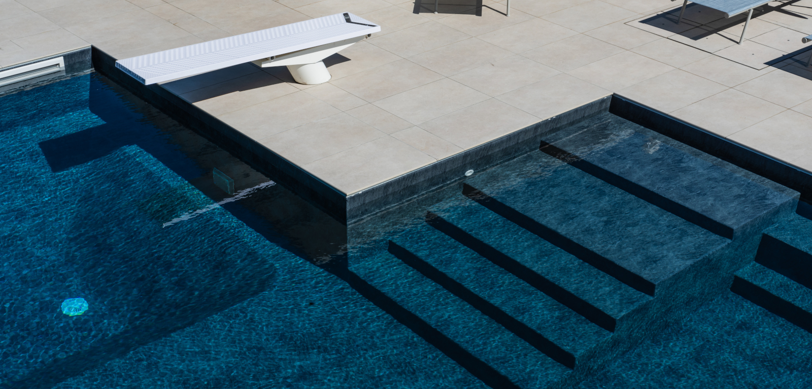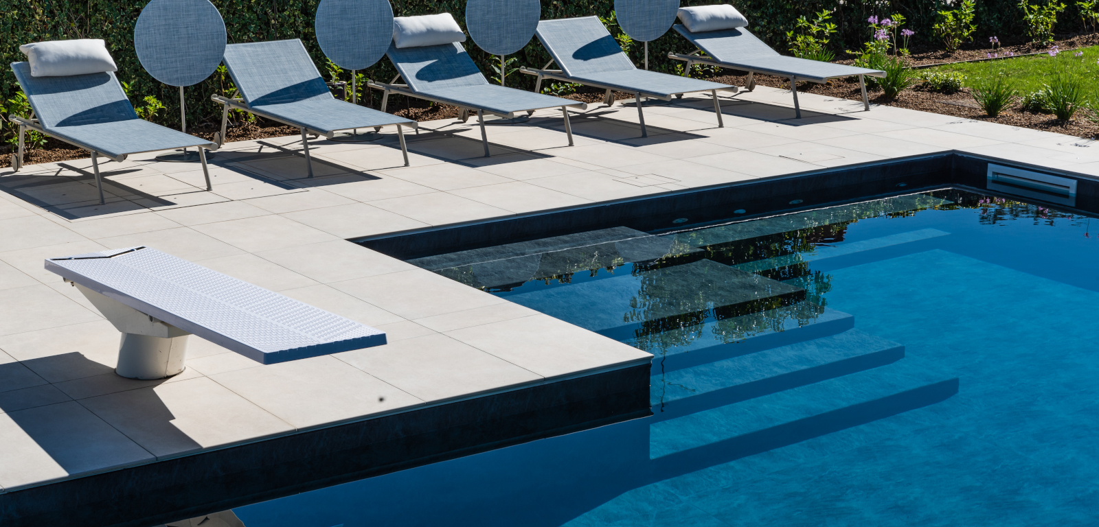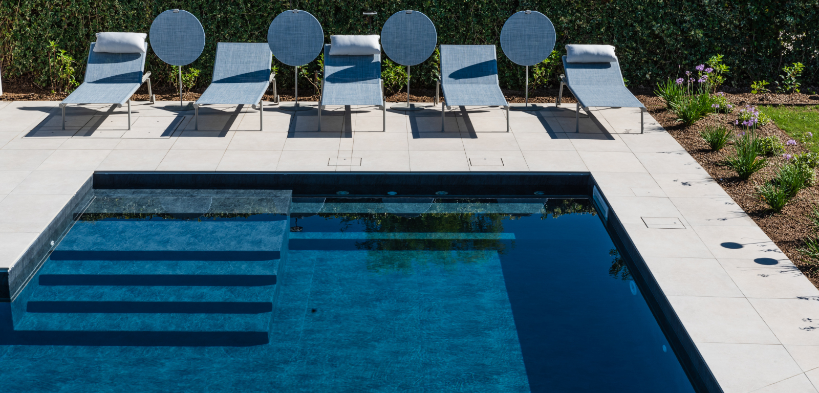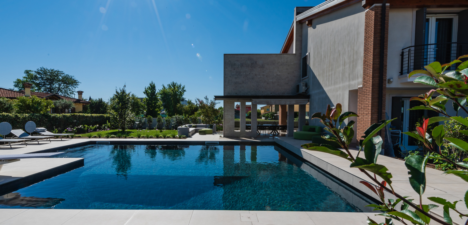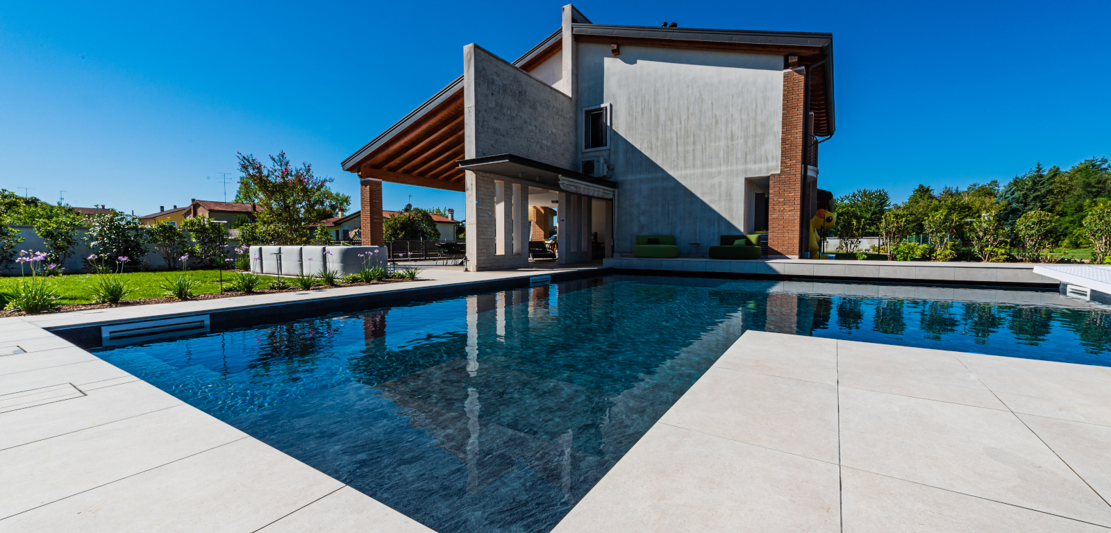 La piscina di un azzurro profondo, a fianco della casa, spicca per la forma a elle e i colori: i toni scuri del rivestimento interno in PVC touch Elegance contrastano con la finitura esterna in gres.