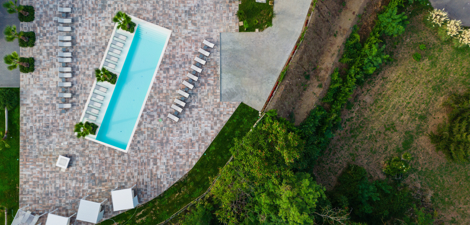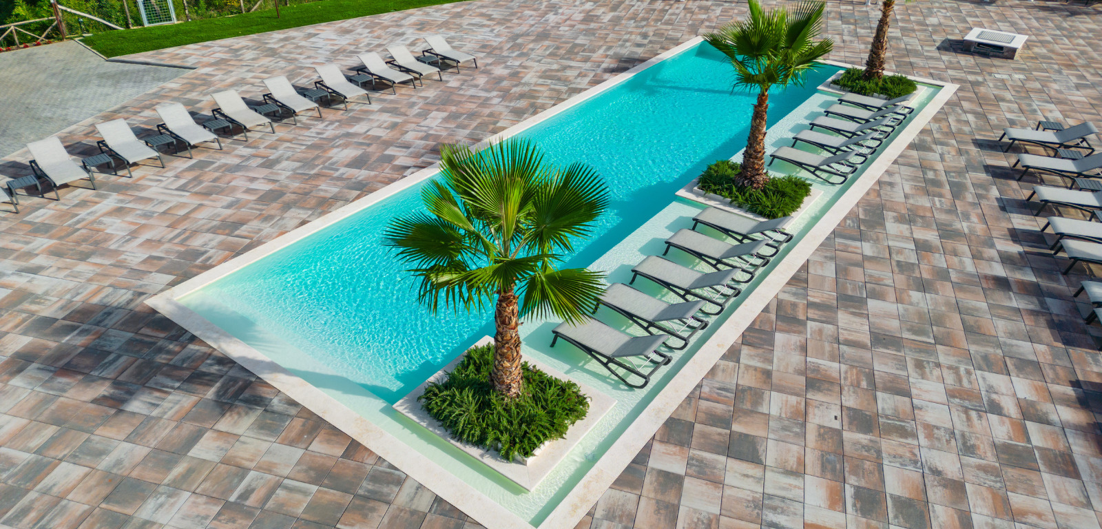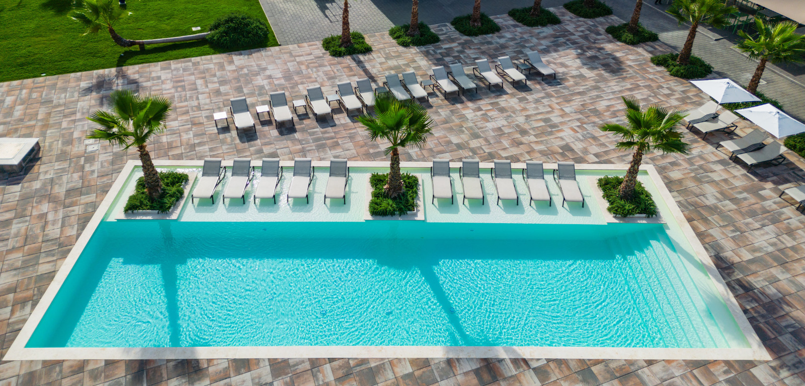 Un effetto visivo gioca con la percezione dei volumi, originando l’effetto a specchio: l’ambiente circostante viene riflesso nell’acqua che, grazie alla migliore filtrazione consentita dal bordo a sfioro, risulta di qualità ottimale garantendo una balneazione sicura e piacevole a tutti gli ospiti della struttura.