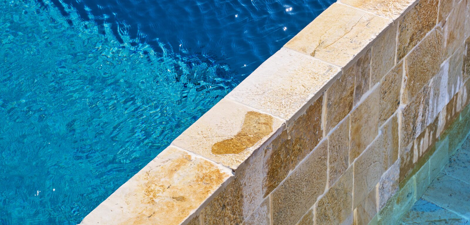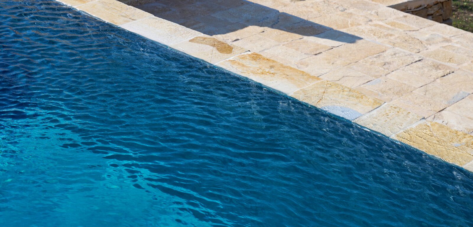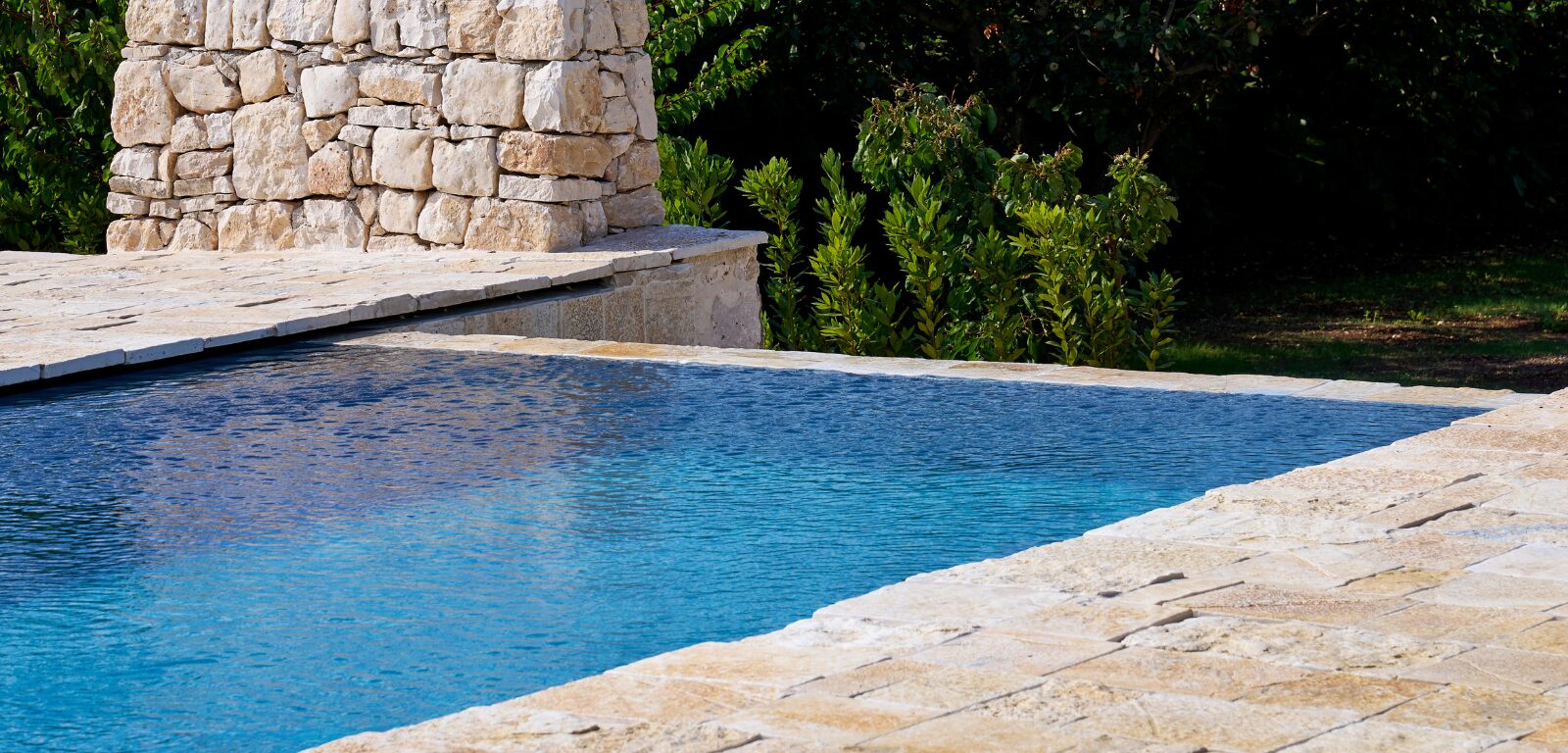 Le proporzioni allungate e la profondità uniforme rendono la piscina ideale per il relax, mentre l’acqua è esaltata dalla pietra, che amplifica la sensazione di quiete. Il rivestimento interno, dalle tonalità scure e naturali, contribuisce a creare un effetto visivo intenso e contemporaneo, capace di esaltare la luce del giorno e trasformarsi al calare della sera.