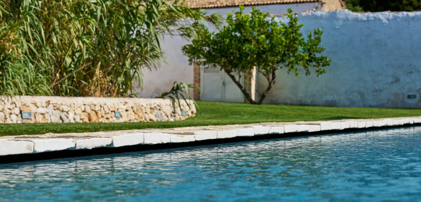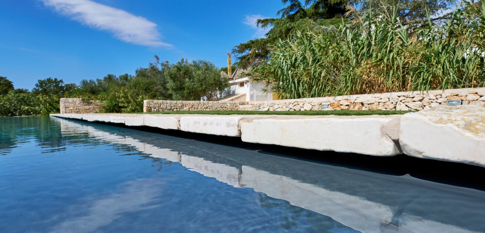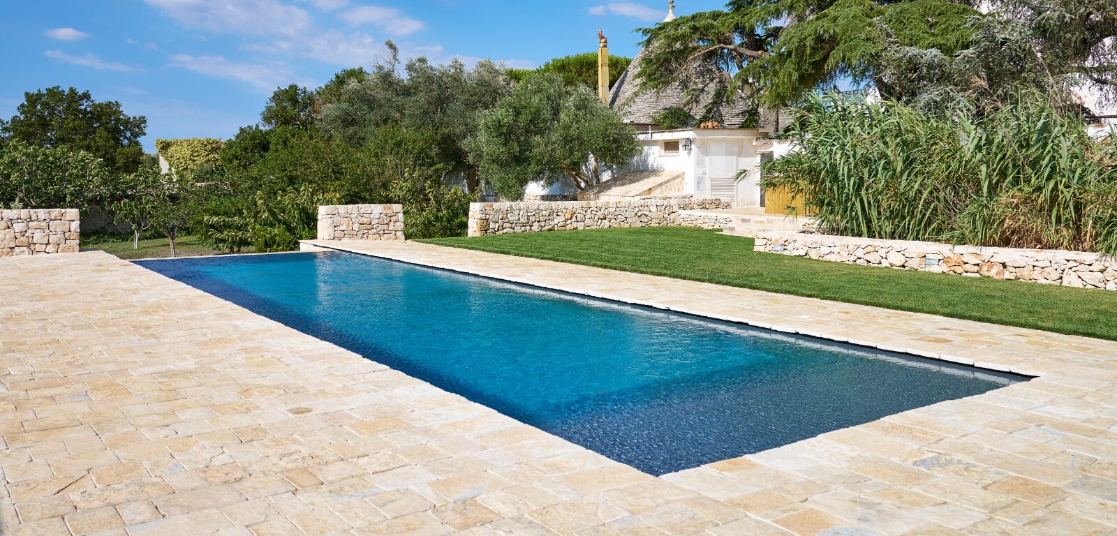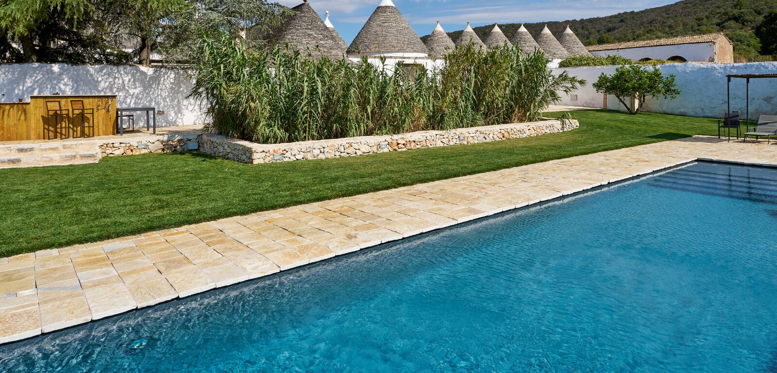 Immersa nel paesaggio autentico della Valle d’Itria, questa piscina nasce all’interno di una storica masseria agricola, dove architettura rurale e natura dialogano in perfetto equilibrio. La vasca si sviluppa come una linea d’acqua elegante e discreta, pensata per valorizzare gli spazi aperti senza mai imporsi sul contesto.