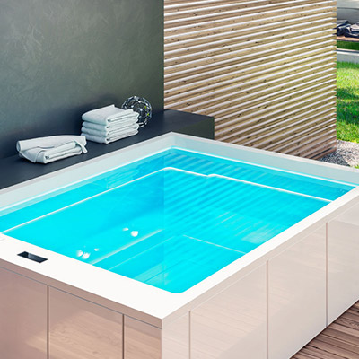 Dotata di accessori esclusivi come un sistema di idromassaggio, faretti a 3 LED integrati nella scala e geyser, la piscina trasforma ogni bagno in un’esperienza sensoriale unica.