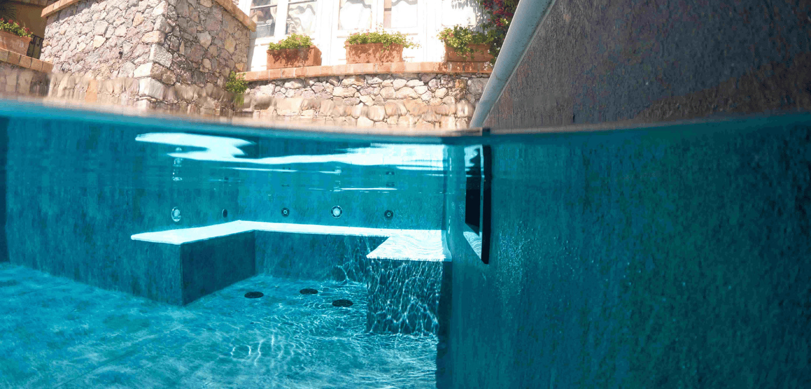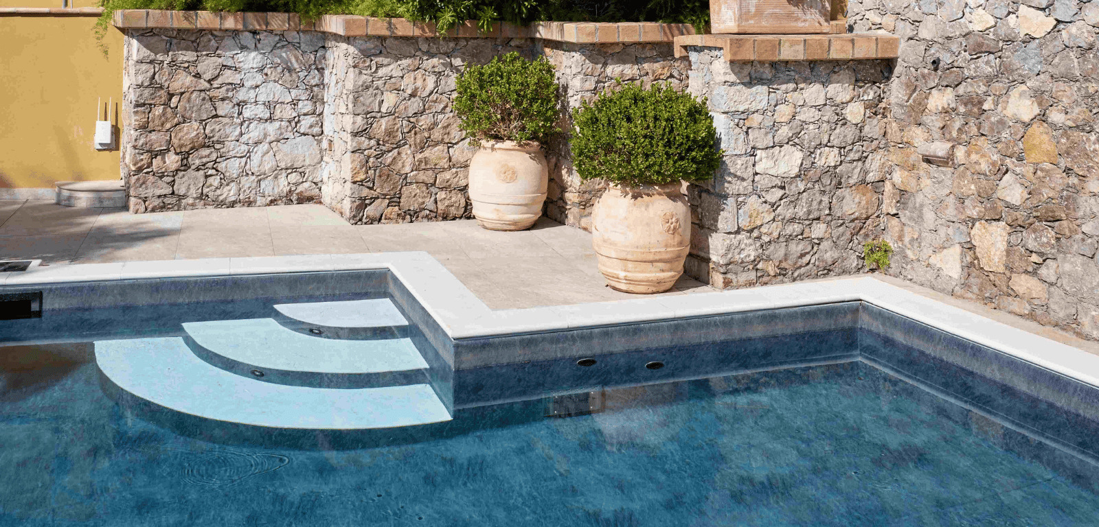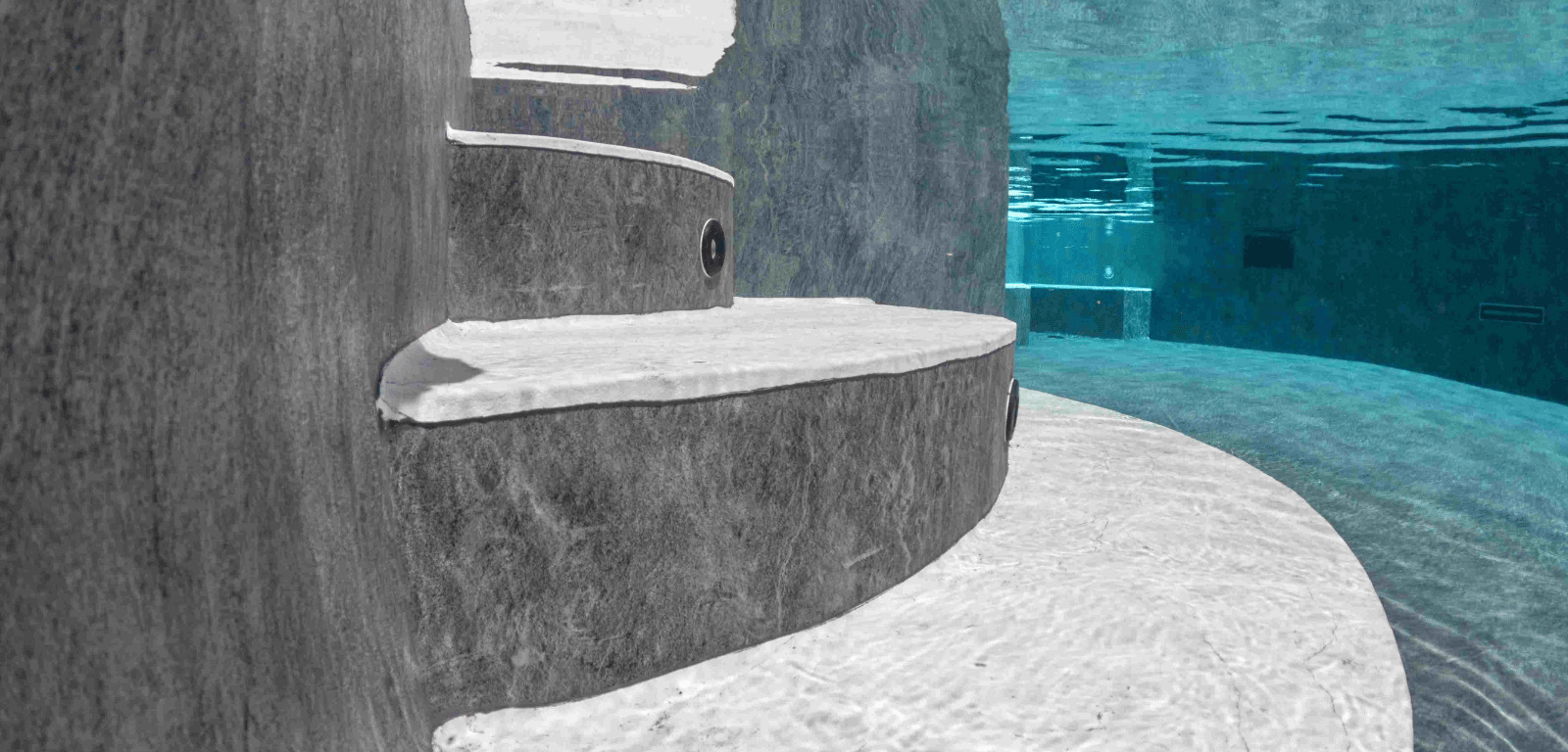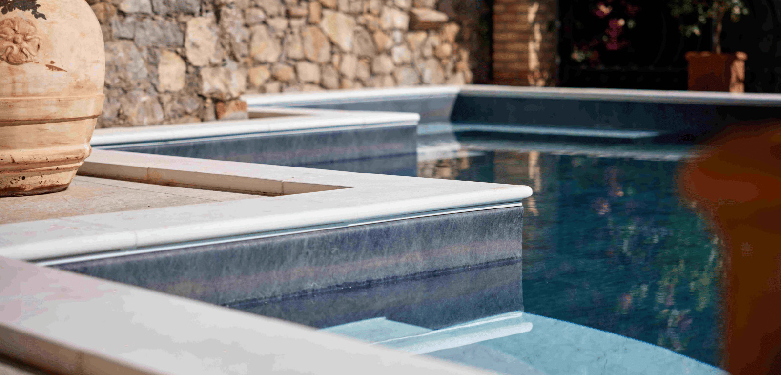 Il rivestimento interno, arricchito da dettagli vanity su pedate e sedute, regala all’acqua un’eleganza senza tempo, mentre il rivestimento esterno in ceramica aggiunge un tocco raffinato.