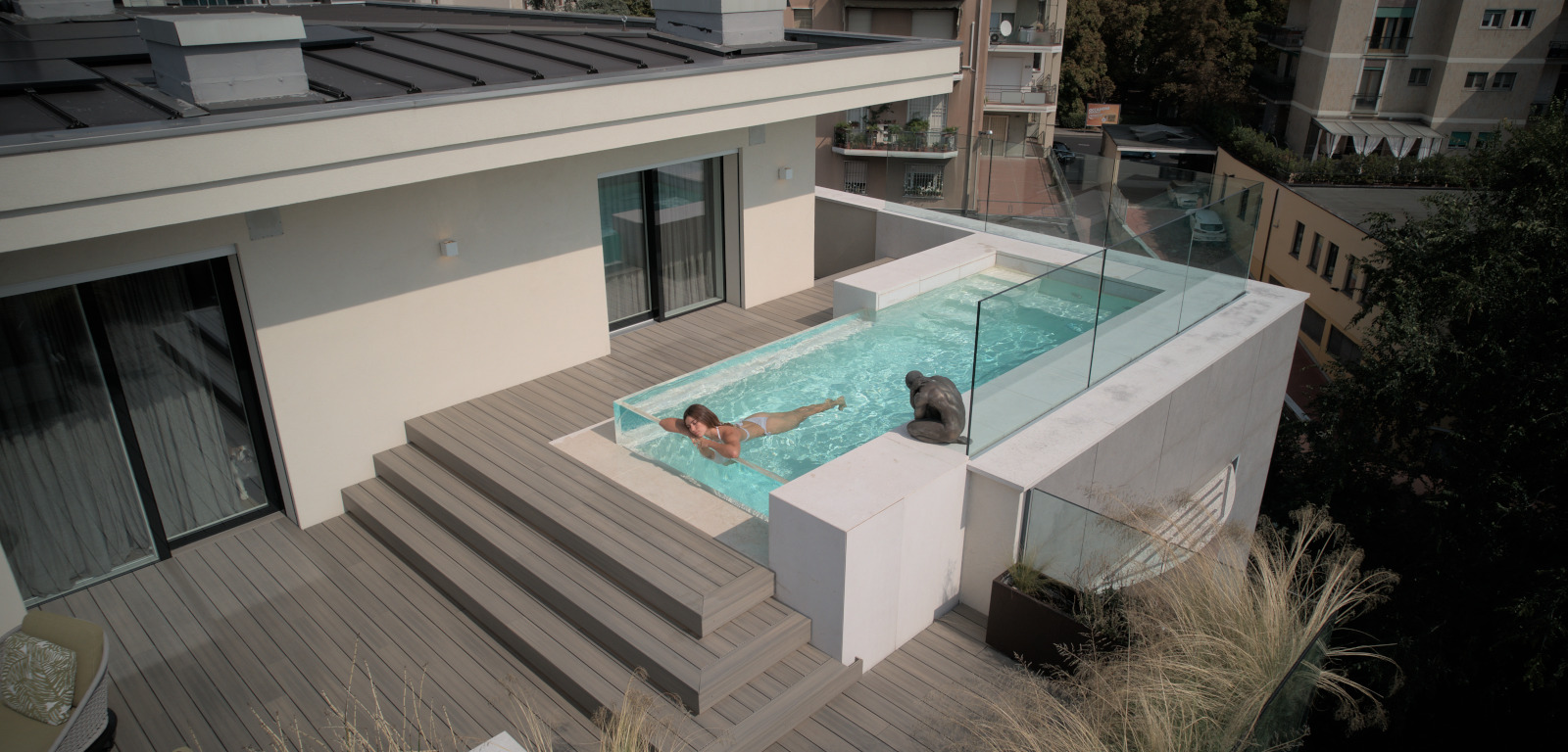 Il terrazzo di un attico nel centro di Brescia è la location che ospita questa splendida piscina fuori terra.