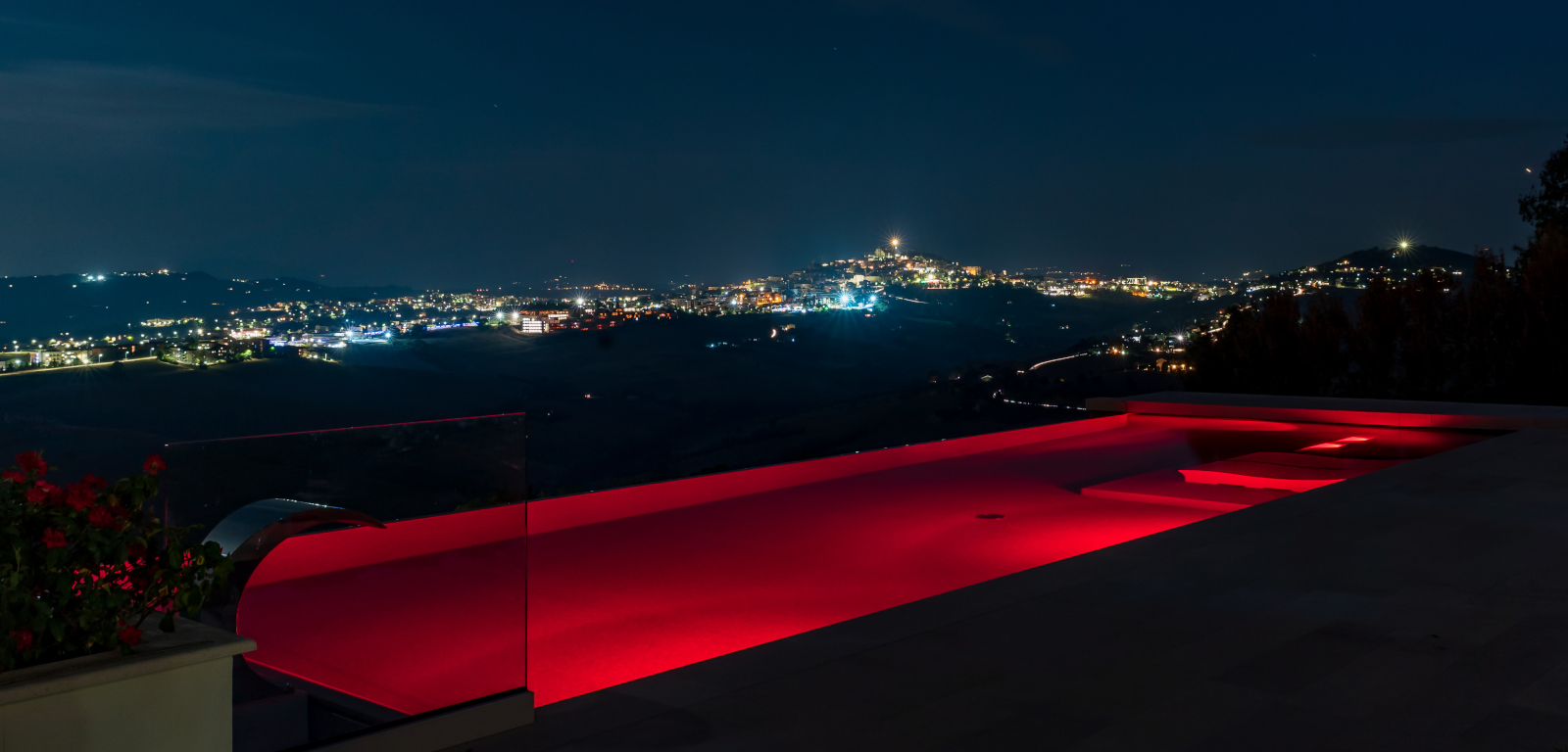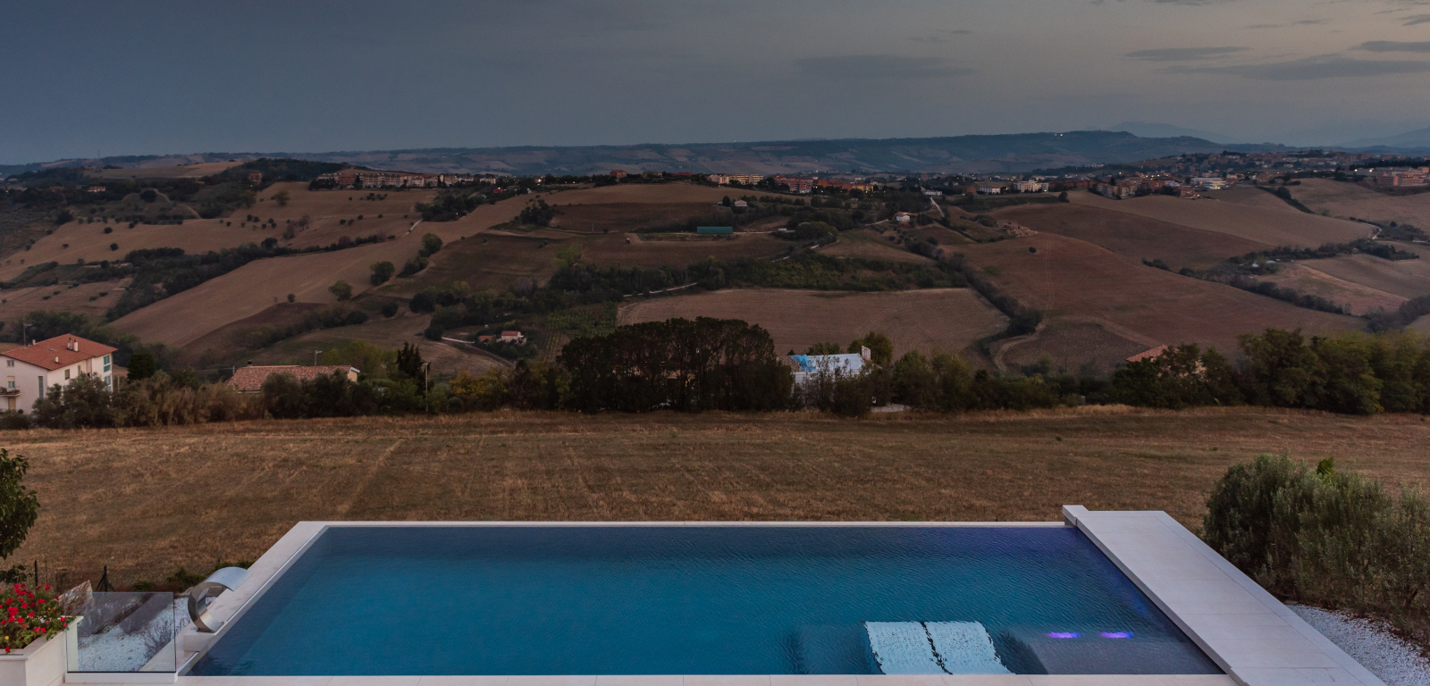 L’entroterra marchigiano è il panorama che accoglie questa piscina. Caratterizzata da ben due tipi di sfioro, a cascata su due lati e nascosto su un lato lungo, è una realizzazione che con il suo blu intenso contrasta con i colori neutri e l’ambiente brullo tutt’intorno.