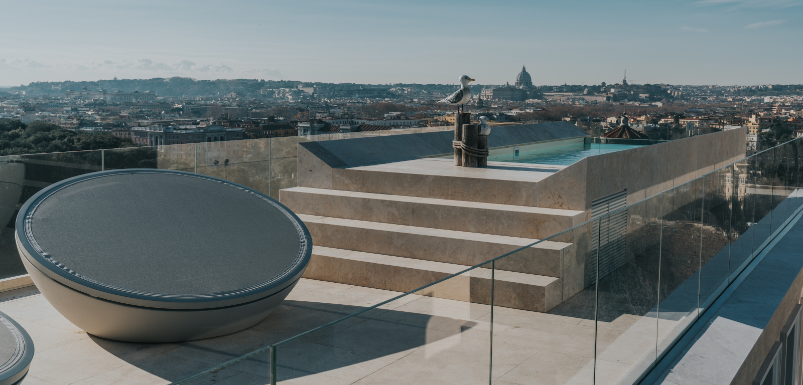 Lo spazio outdoor di questo attico con vista privilegiata su Roma è stato ulteriormente valorizzato con l’installazione di una piscina dalle dimensioni contenute ma dotata di ogni comfort.